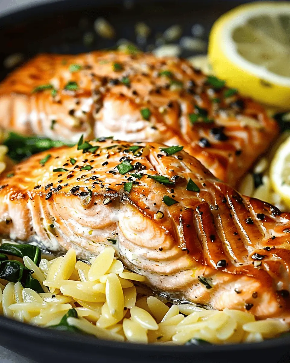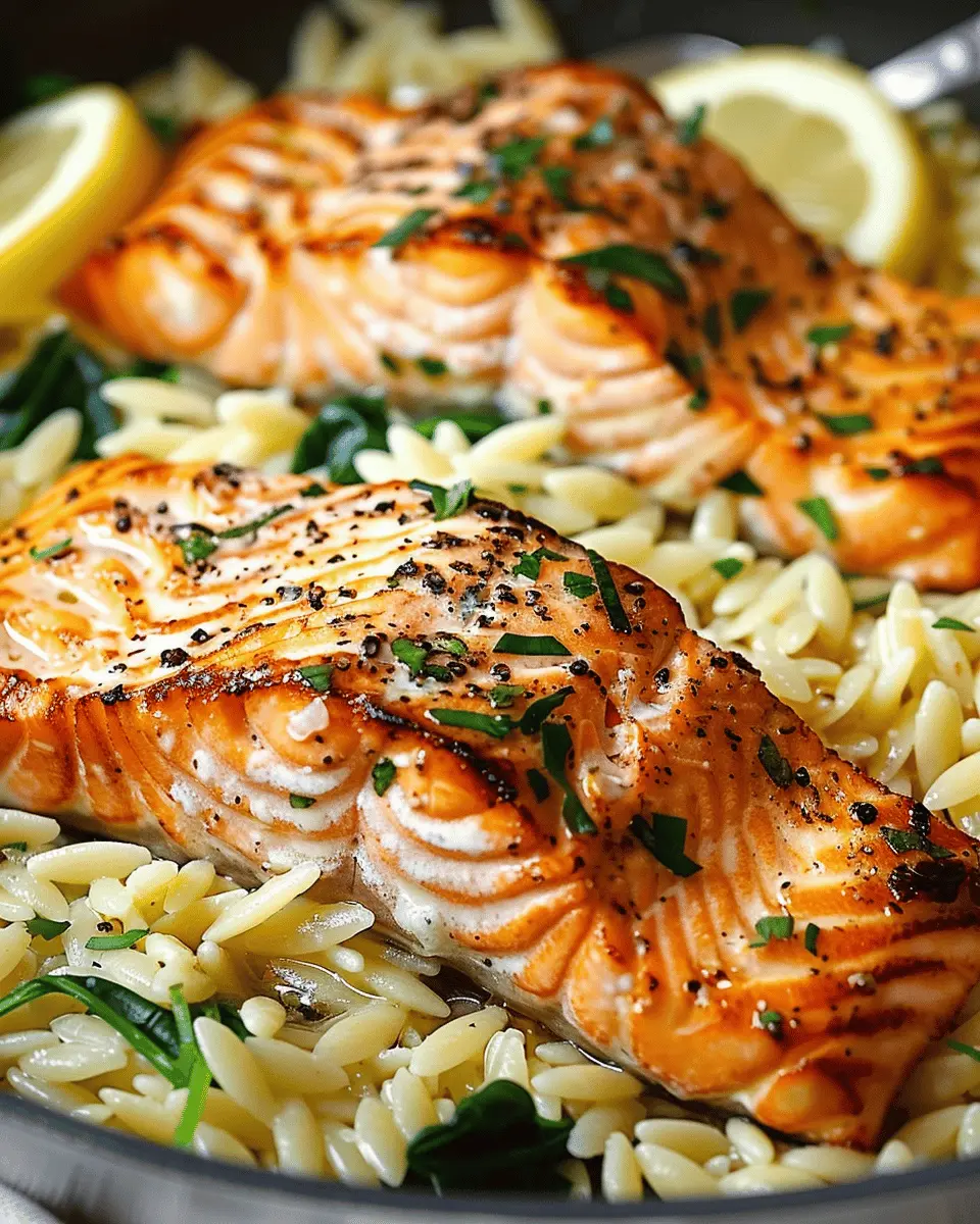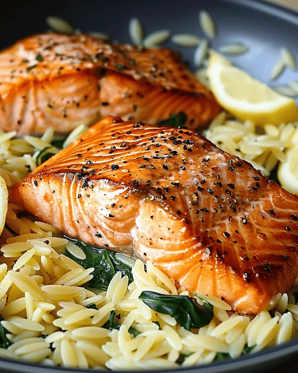 A quick and delicious weeknight meal that brings together perfectly seared salmon and zesty lemon orzo.