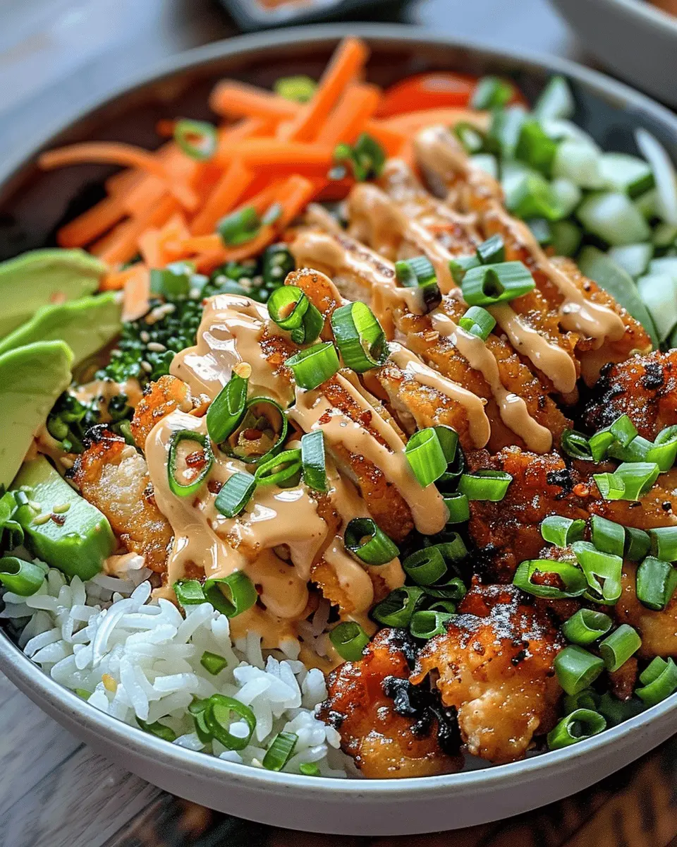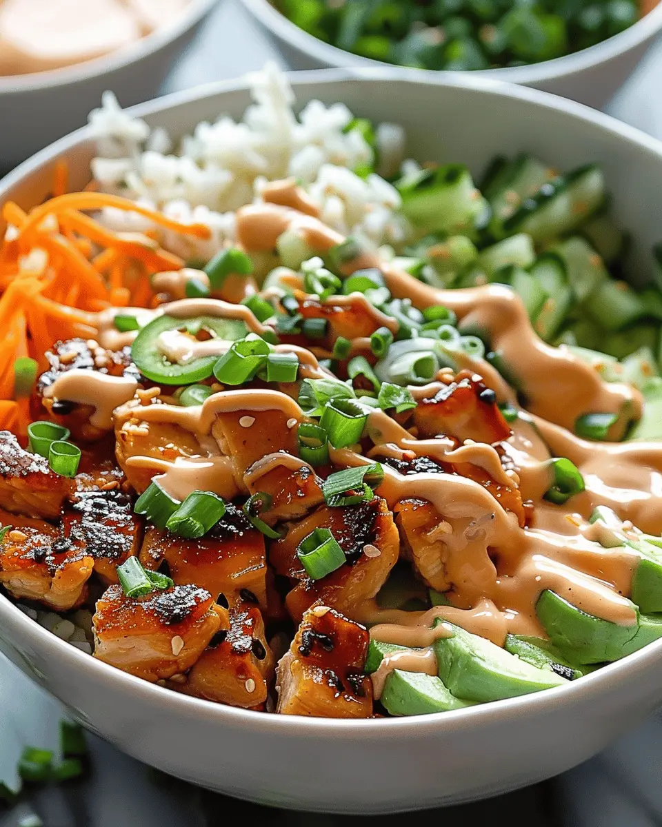 Fresh veggies add texture and color, elevating your Bang Bang Chicken Bowl to new heights.