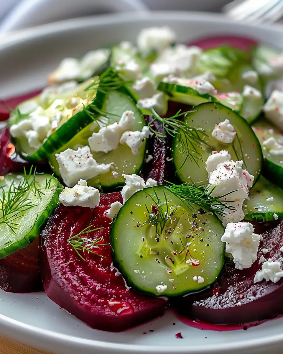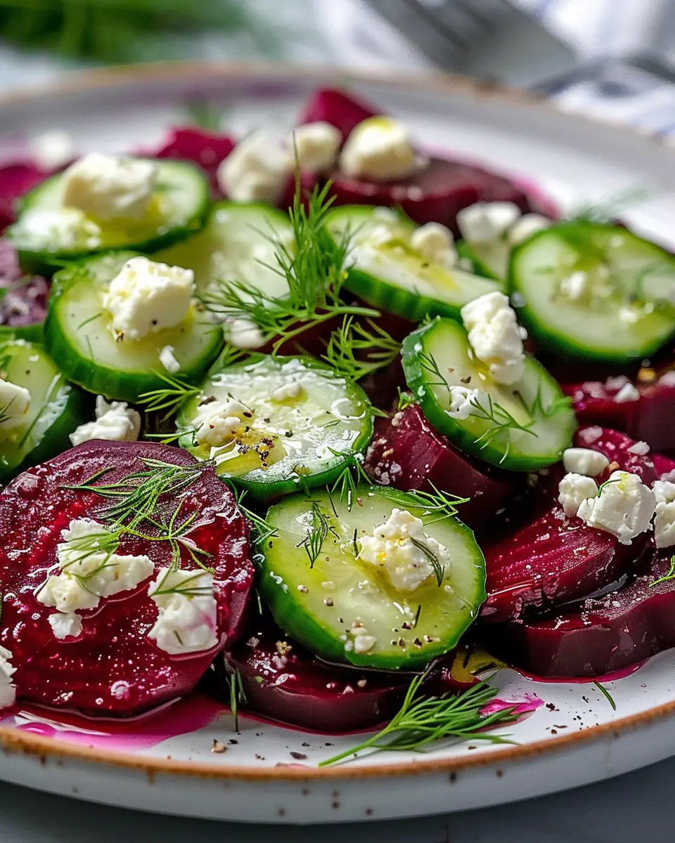 Dive into the vibrant world of beet salad with feta, cucumbers, and dill, and let your taste buds explore wholesome indulgence!