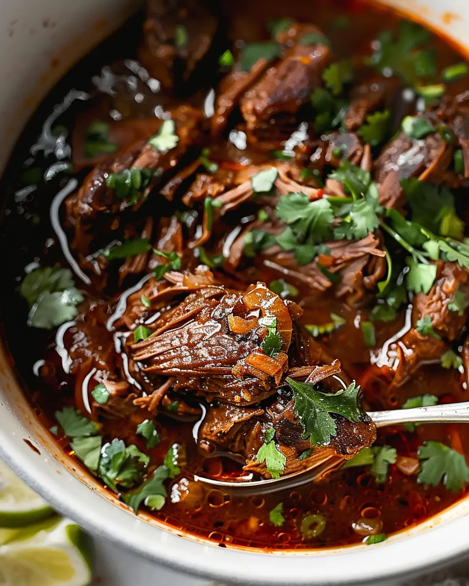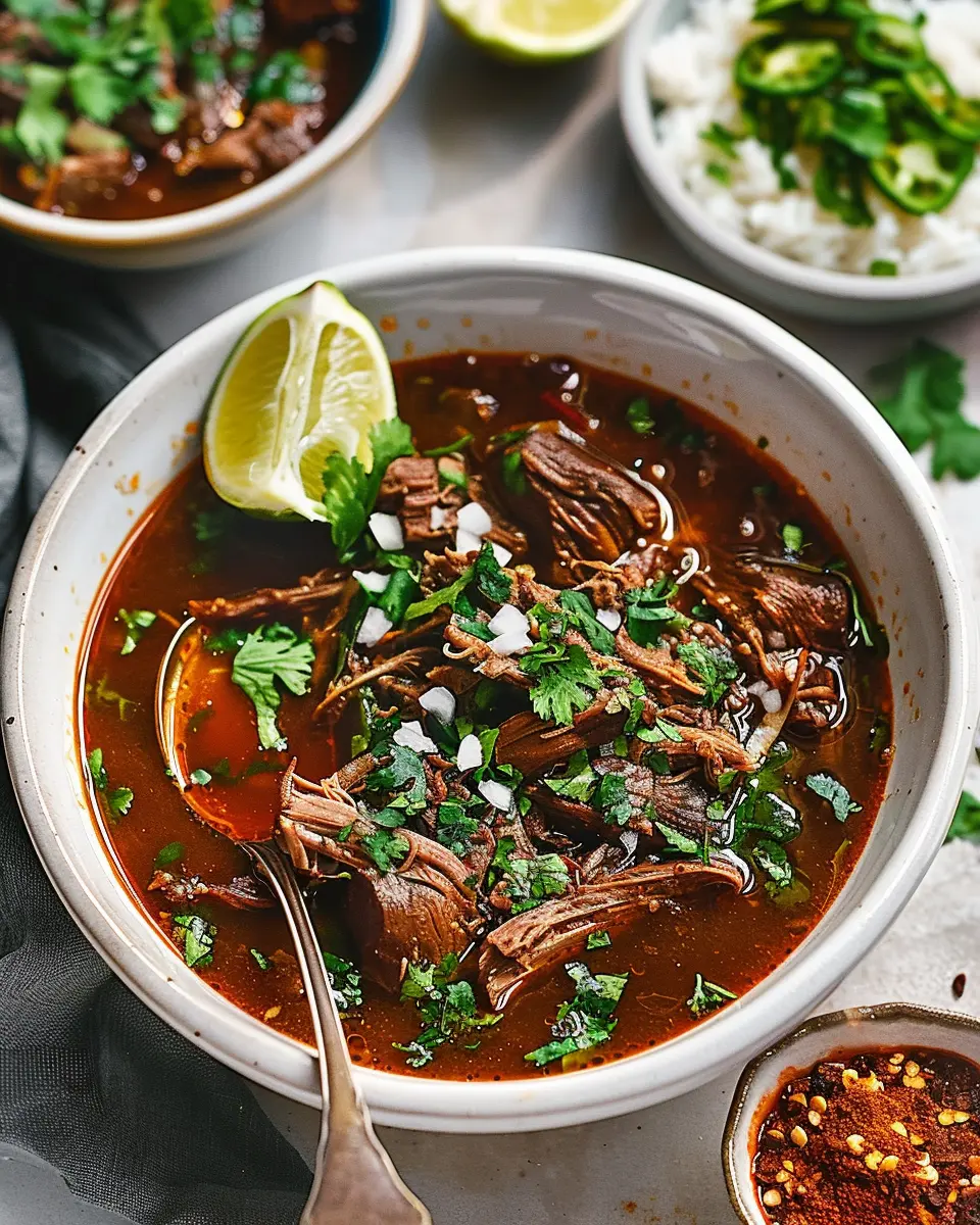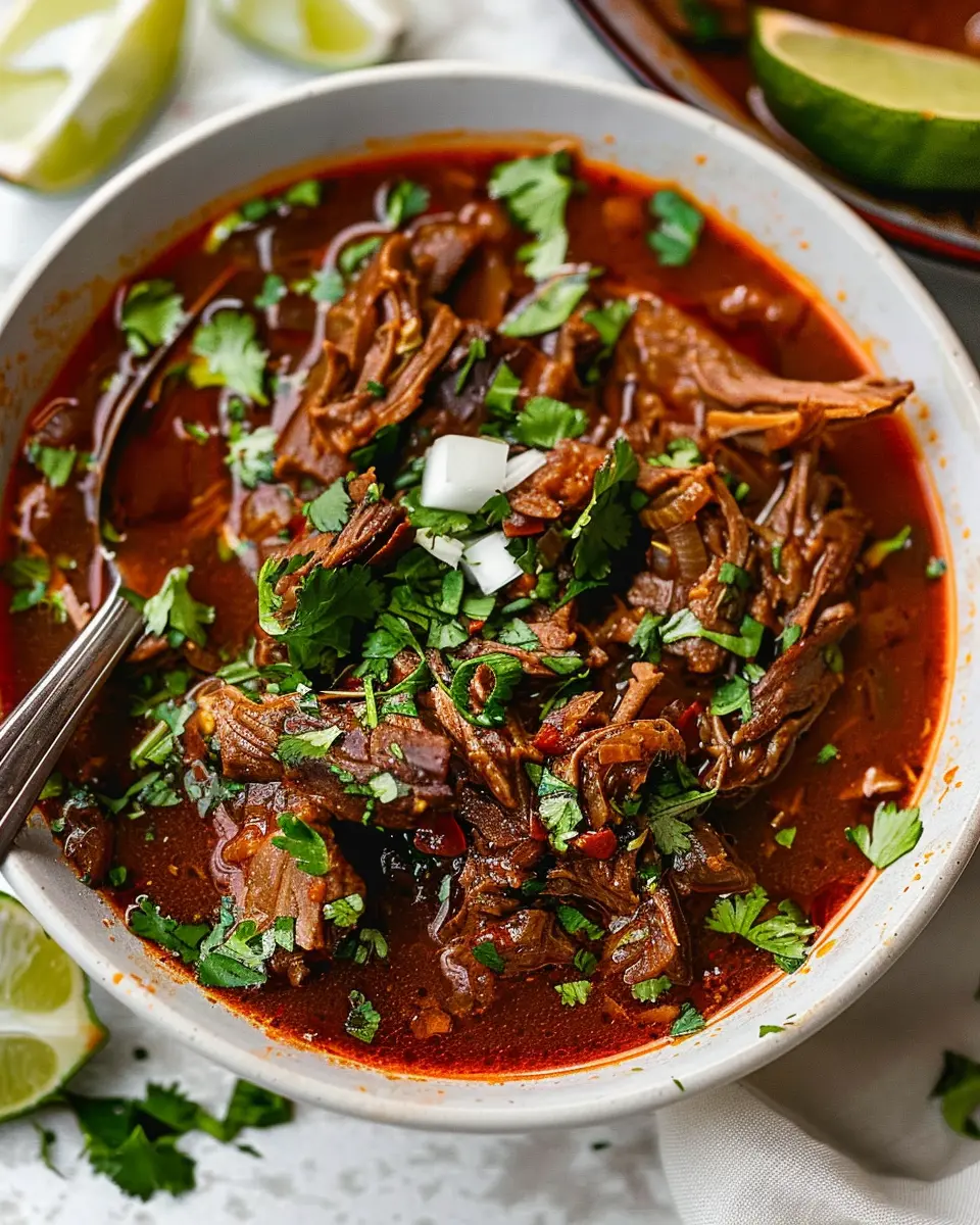 And finally, the moment you’ve been waiting for—serving your Birria. Traditionally, it’s served with warm tortillas, chopped onions, cilantro, and a squeeze of lime. Don’t forget a bowl on the side for that rich consomé—you’ll want to sip it up! If you’re feeling adventurous, try adding toppings like diced avocados or sour cream. That’s the secret to elevating your dish even further!