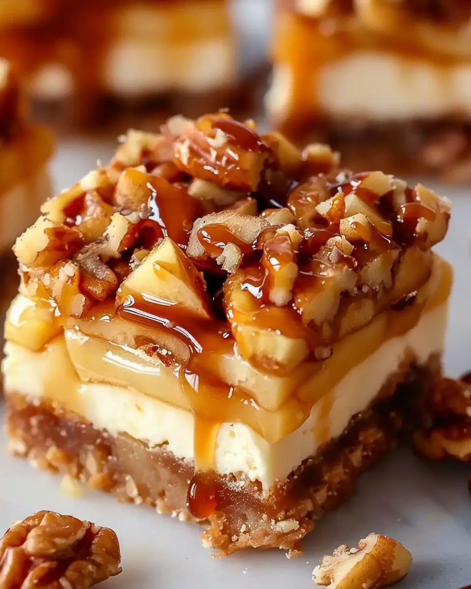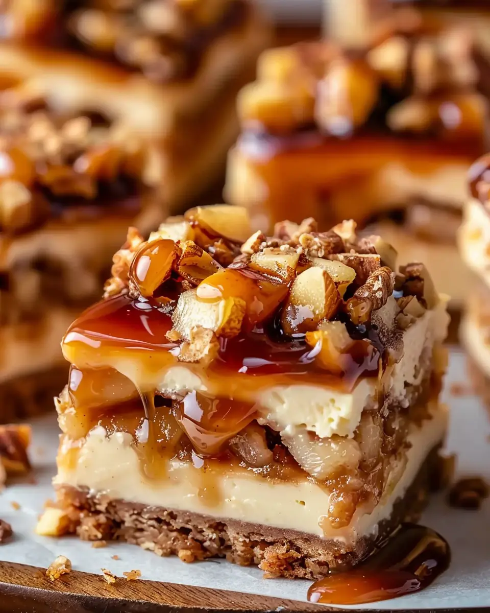 Delicious caramel apple cheesecake bars that combine creamy cheesecake with tart apples and a rich caramel topping, perfect for autumn.