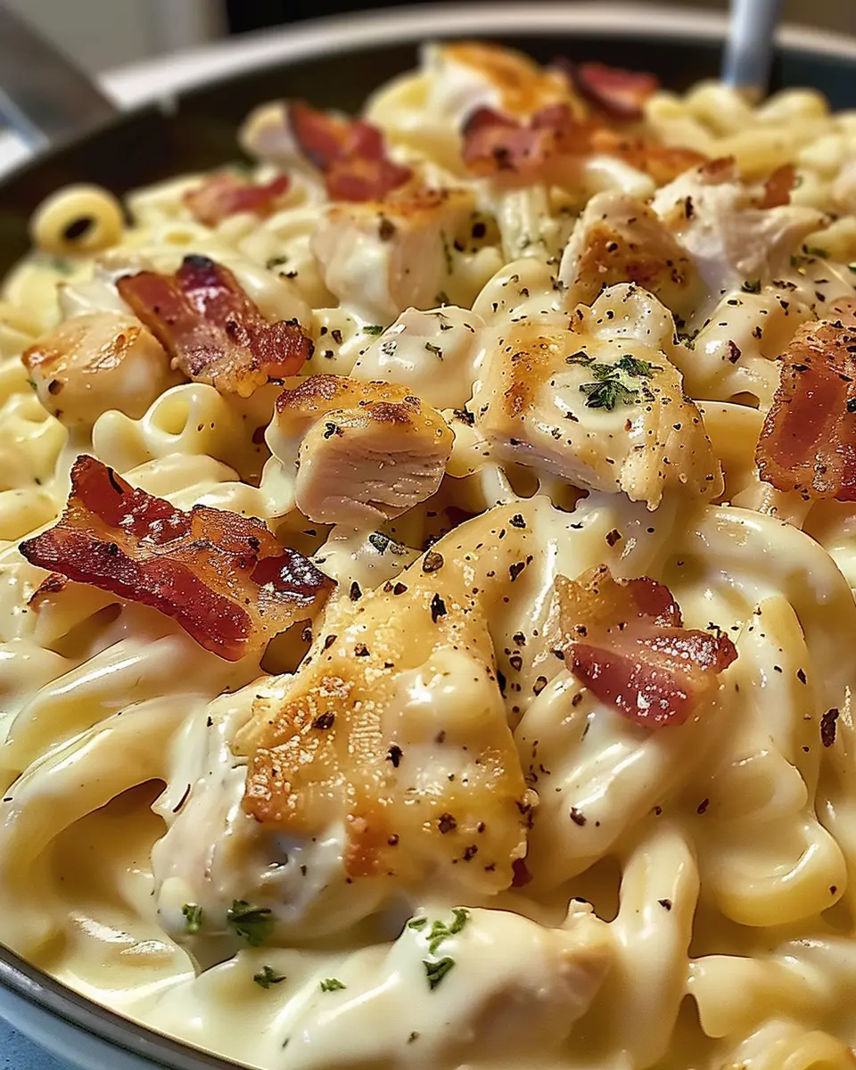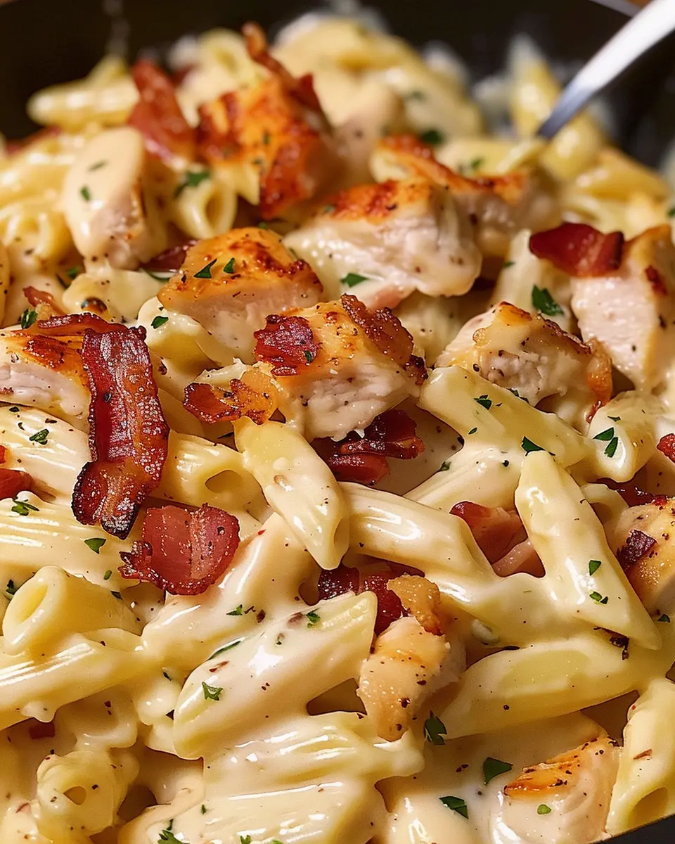 A creamy pasta dish featuring chicken, bacon, and ranch seasoning, perfect for a quick weeknight meal.