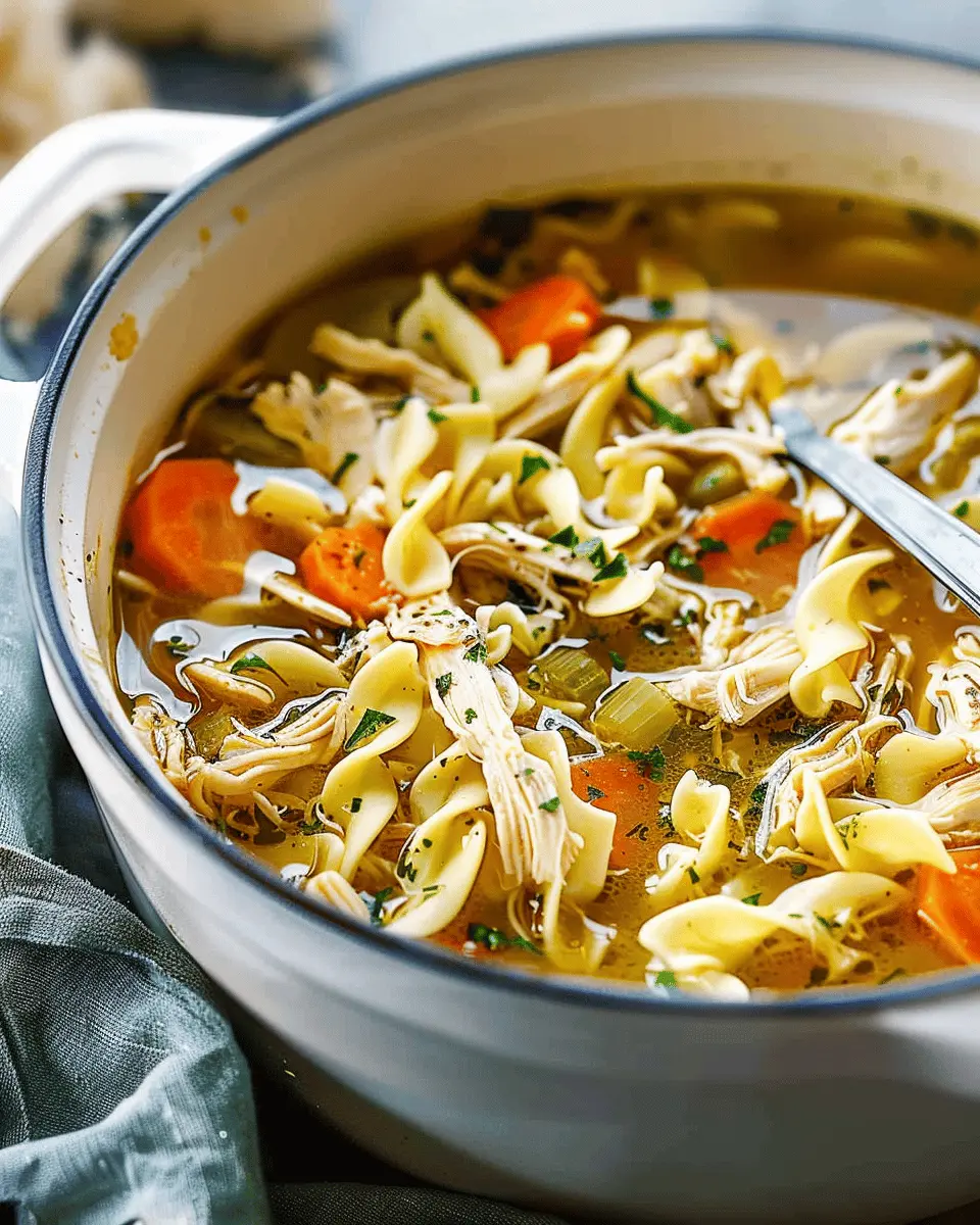 If you have leftovers, let your Chicken Noodle Soup cool completely before transferring it to an airtight container. It can be refrigerated for up to three days or frozen for up to three months. When reheating, do so gently over low heat, adding a splash of water or broth to adjust the consistency, as the noodles might soak up the liquid. Check out this guide on how to properly store soups for more detailed tips!