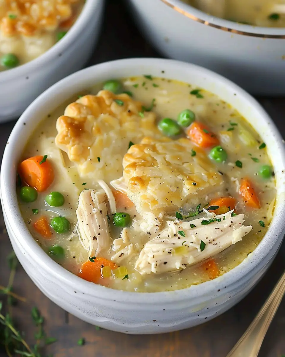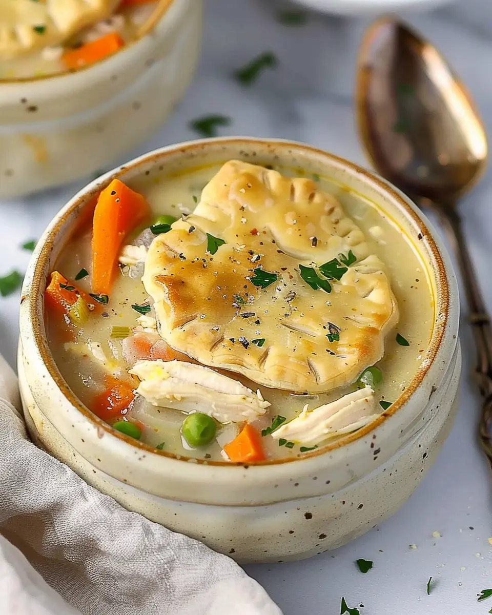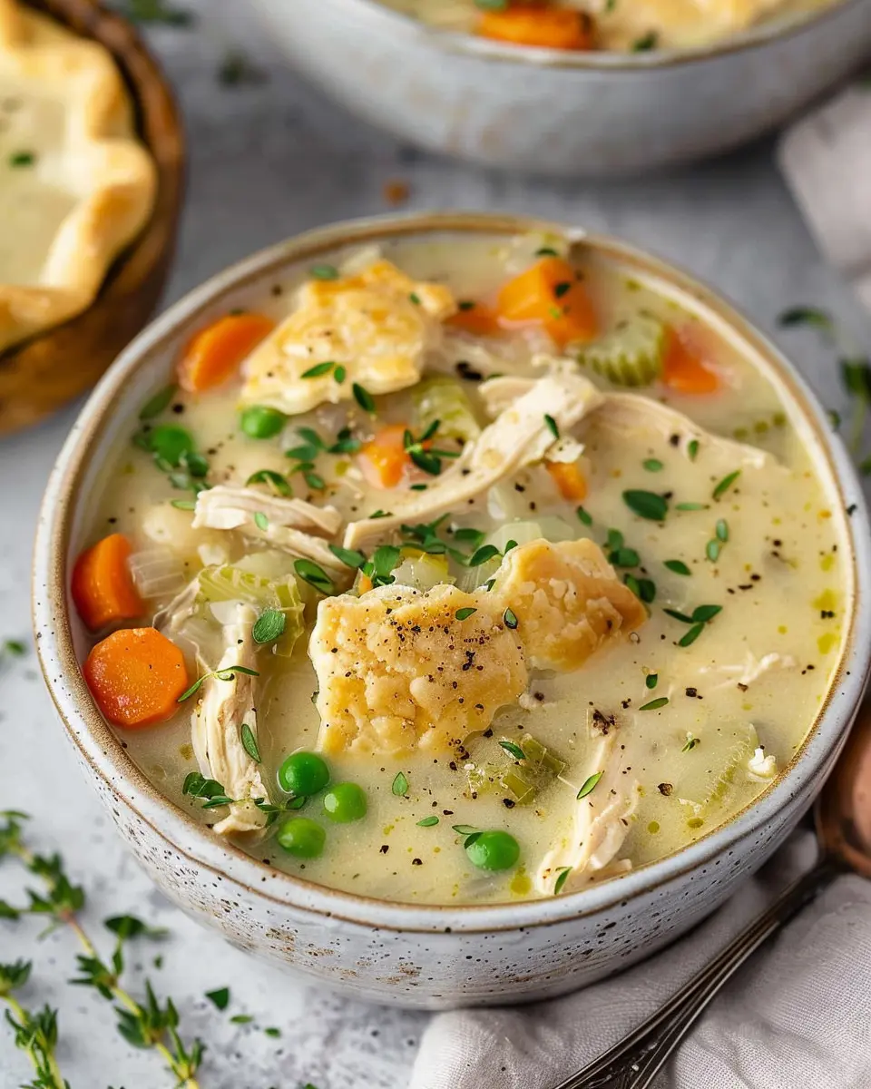 Serve your chicken pot pie soup in hearty bowls, and if you’re feeling fancy, top it with fresh herbs or a sprinkle of turkey bacon for a little crunch. It pairs perfectly with a crusty slice of bread or a light side salad. Guests will surely be asking for seconds!