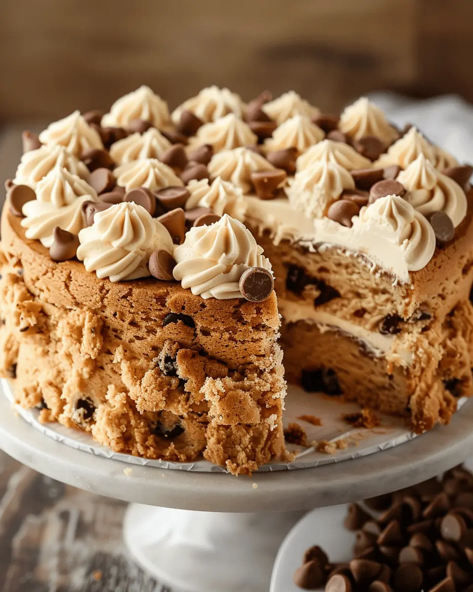Indulge in this delightful Chocolate Chip Cookie Cake topped with a creamy Buttercream Frosting, perfect for any celebration.