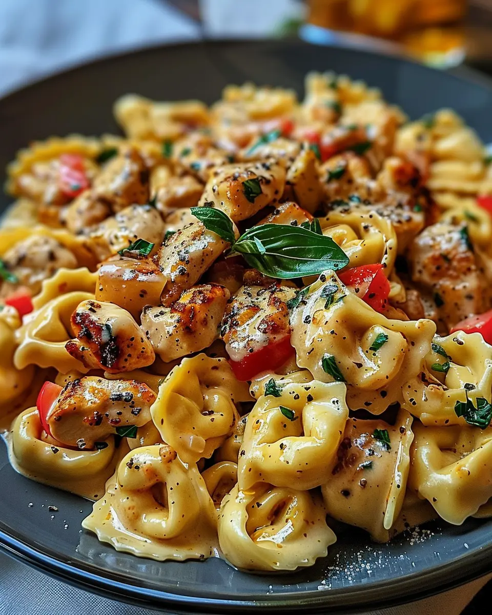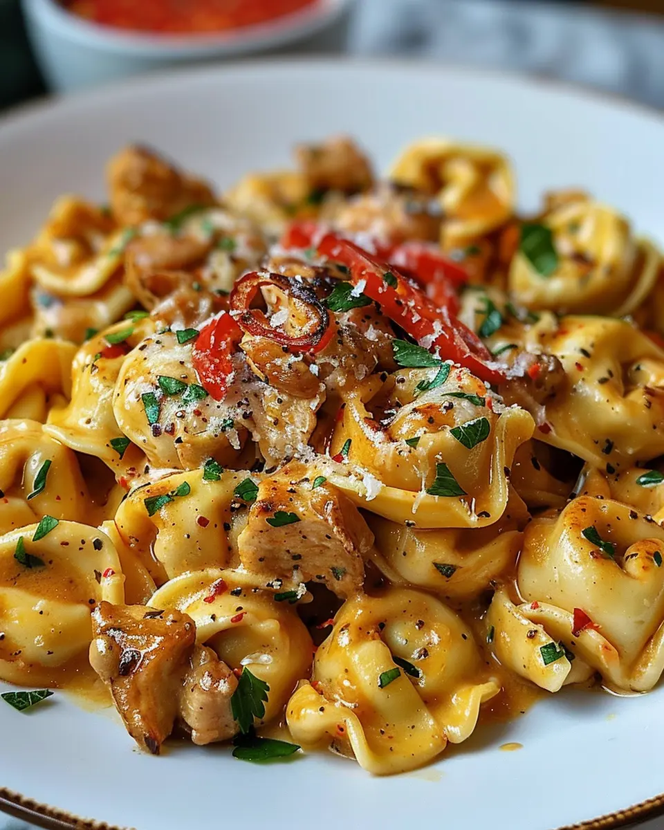 Discover the rich flavors of Cowboy Butter Garlic Chicken Tortellini with Fire-Roasted Red Peppers, a dish that delights with every bite.