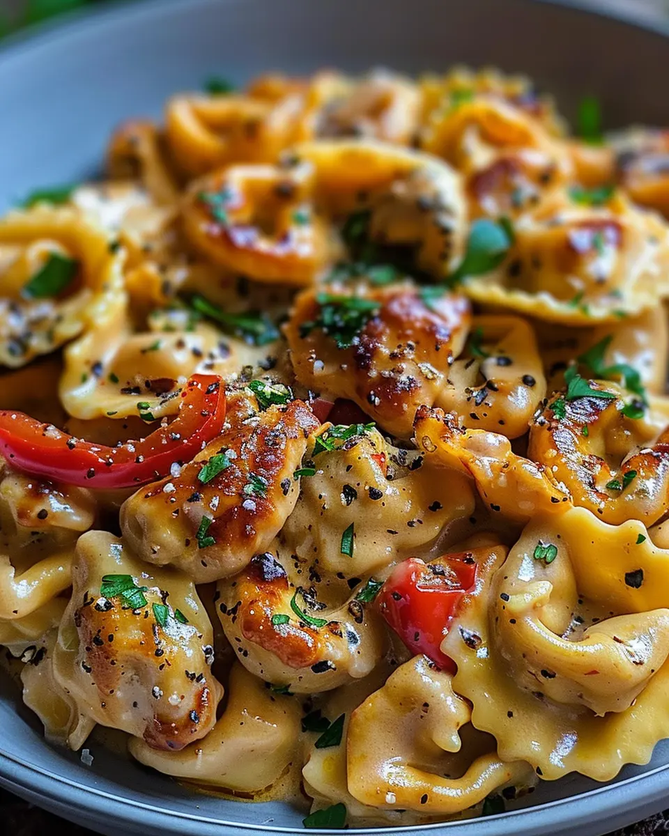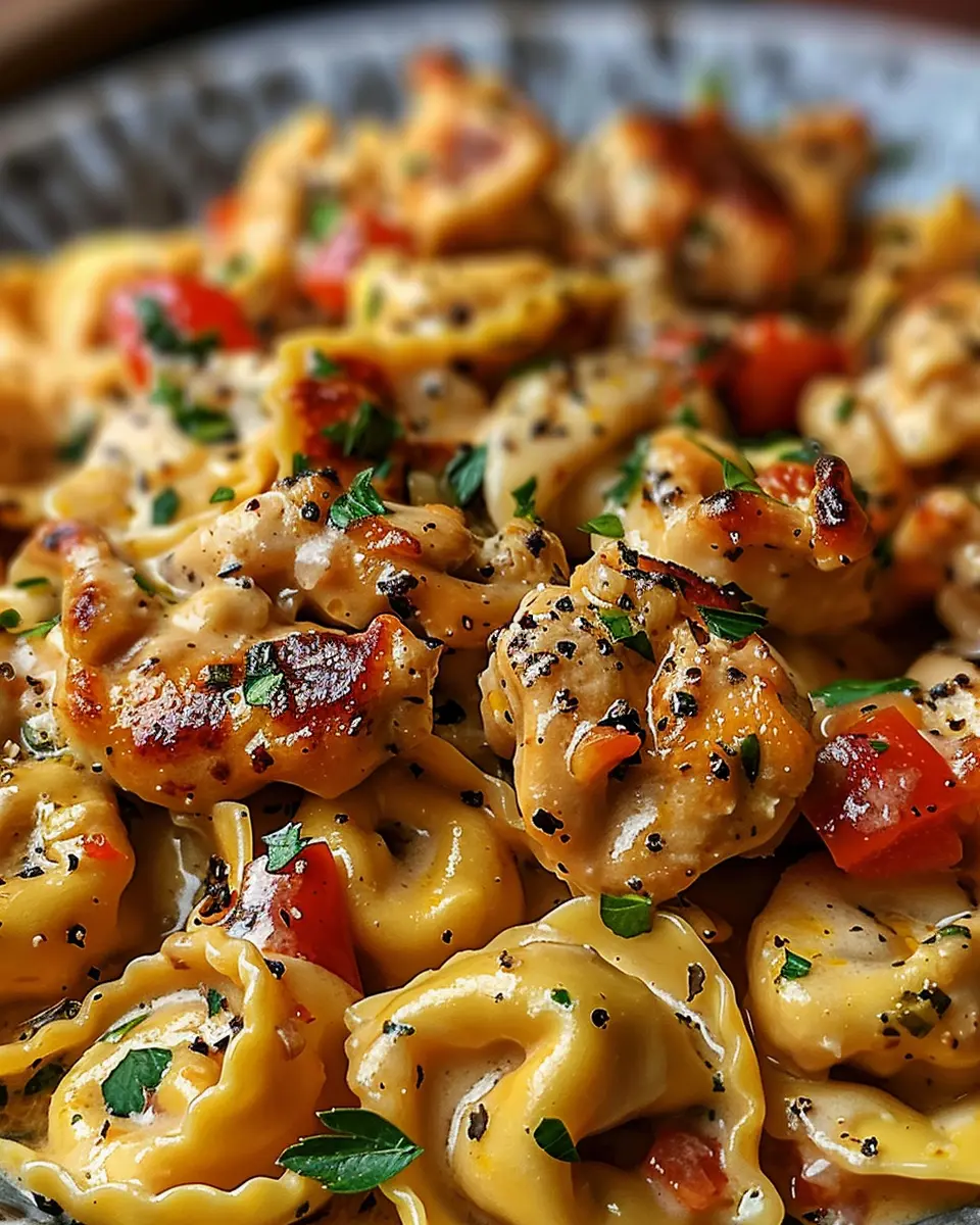 A rich and creamy dish that combines tender tortellini with succulent chicken, garlic, and fire-roasted red peppers.
