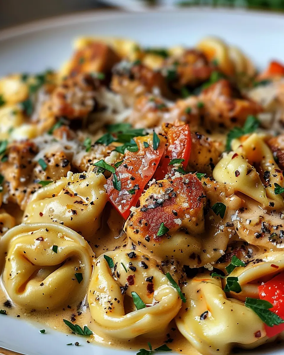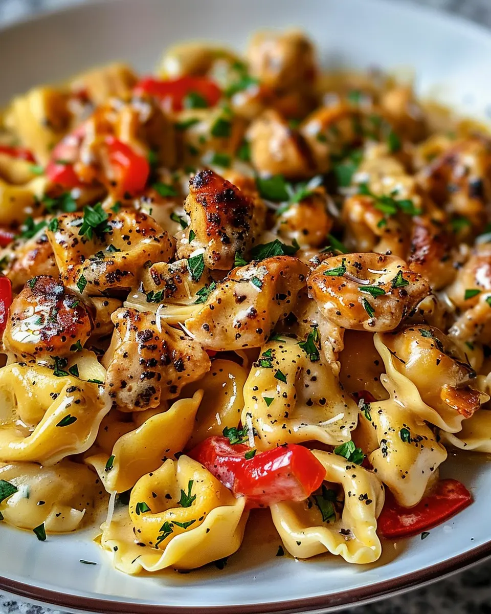 Indulge in the creamy, savory goodness of Cowboy Butter Garlic Chicken Tortellini with Fire-Roasted Red Peppers.
