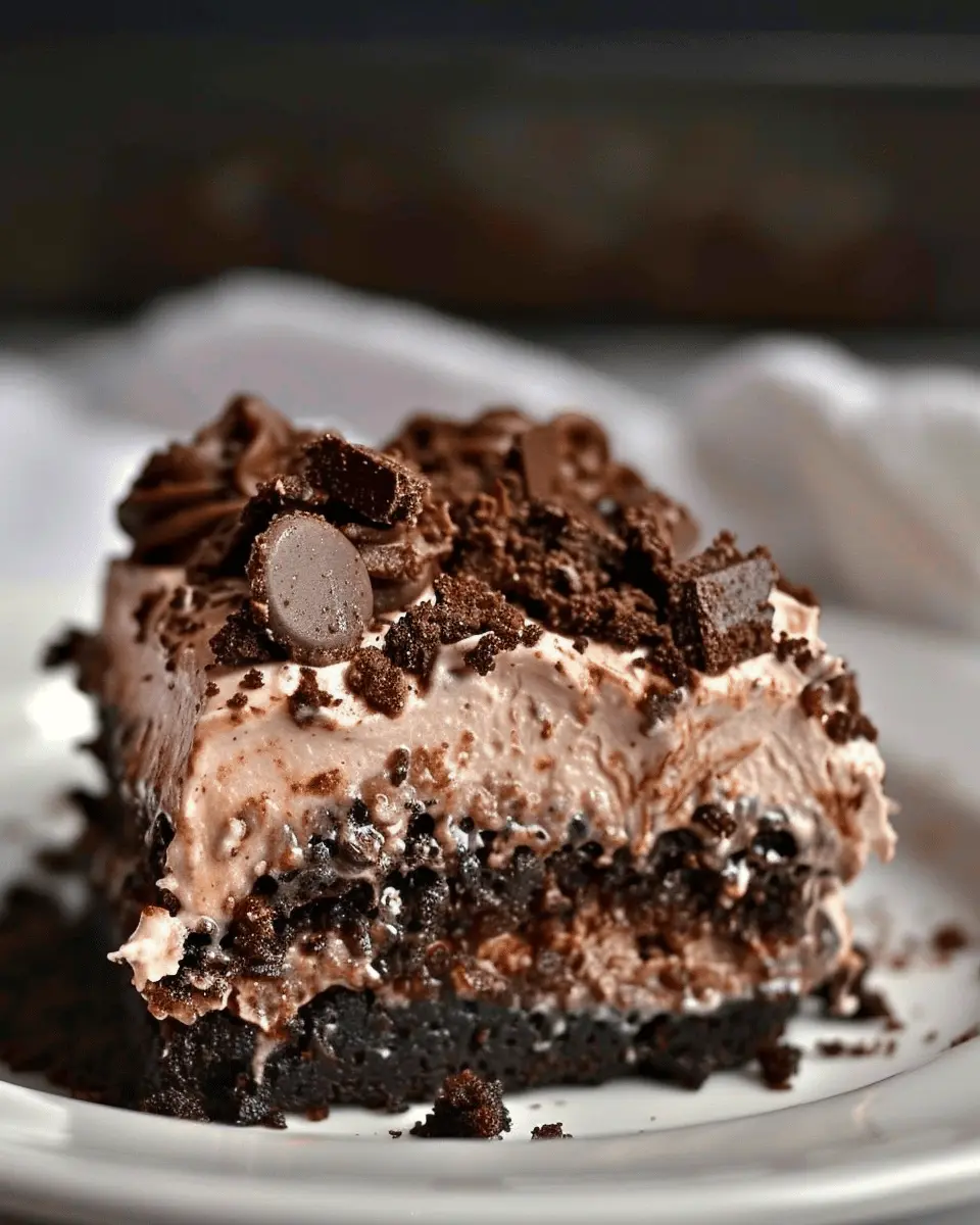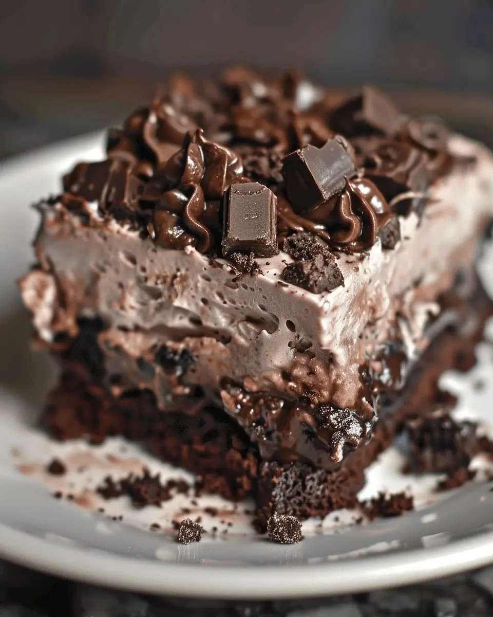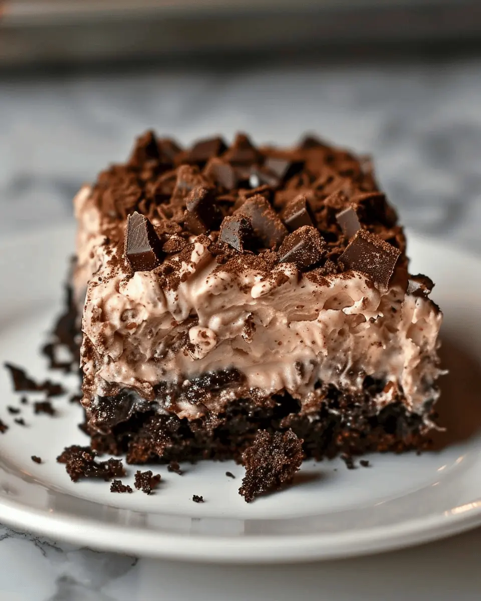 The combination of chocolate pudding and whipped topping creates a delicious, airy texture that complements the rich cake.