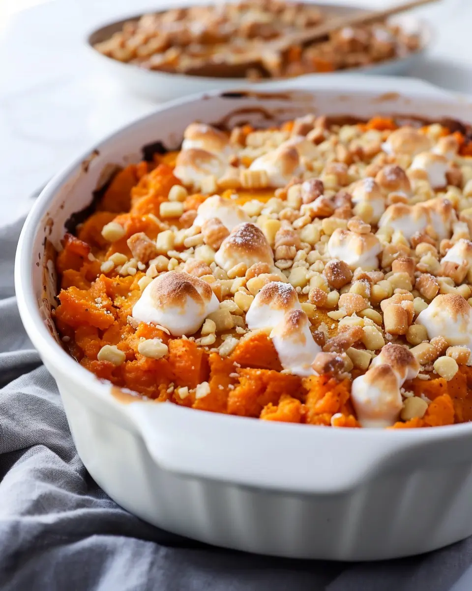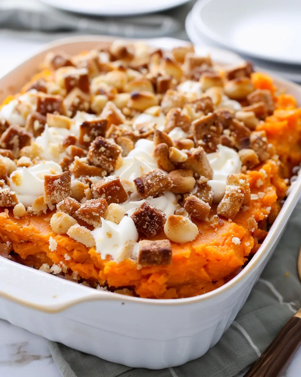 • Optional Topping: For that classic casserole finish, sprinkle a layer of mini marshmallows or crushed nuts on top. Nuts like pecans or walnuts add a delightful crunch that pairs beautifully with the sweet filling.