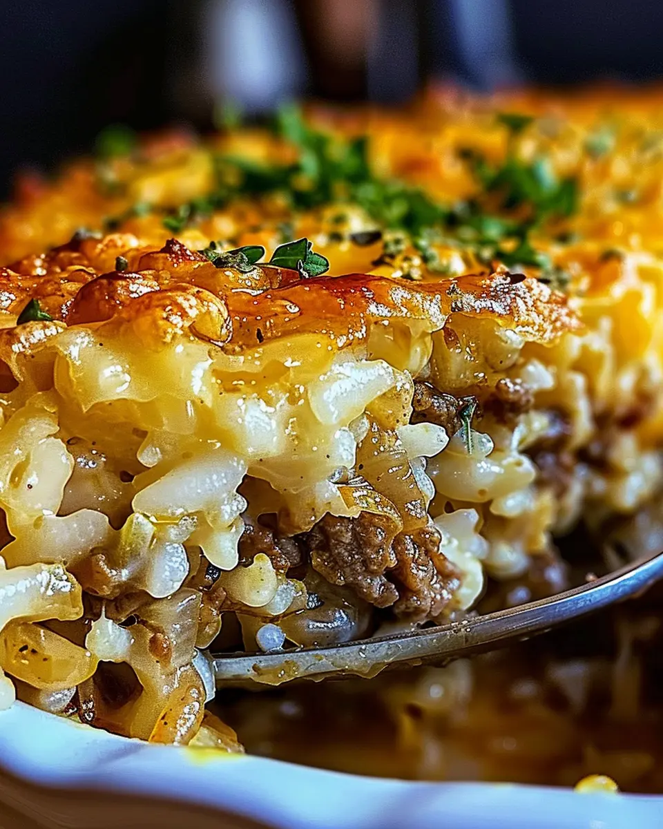 French Onion Ground Beef and Rice Casserole with Turkey Bacon Delight