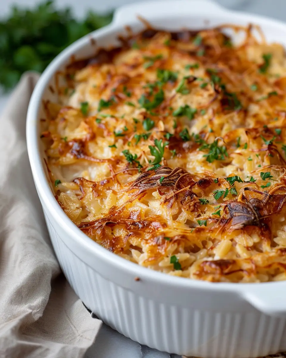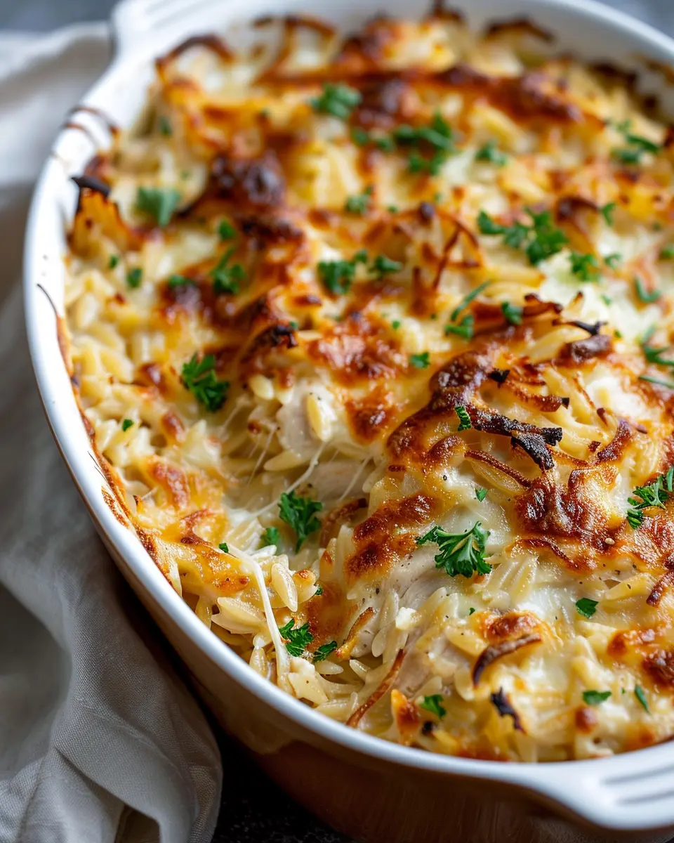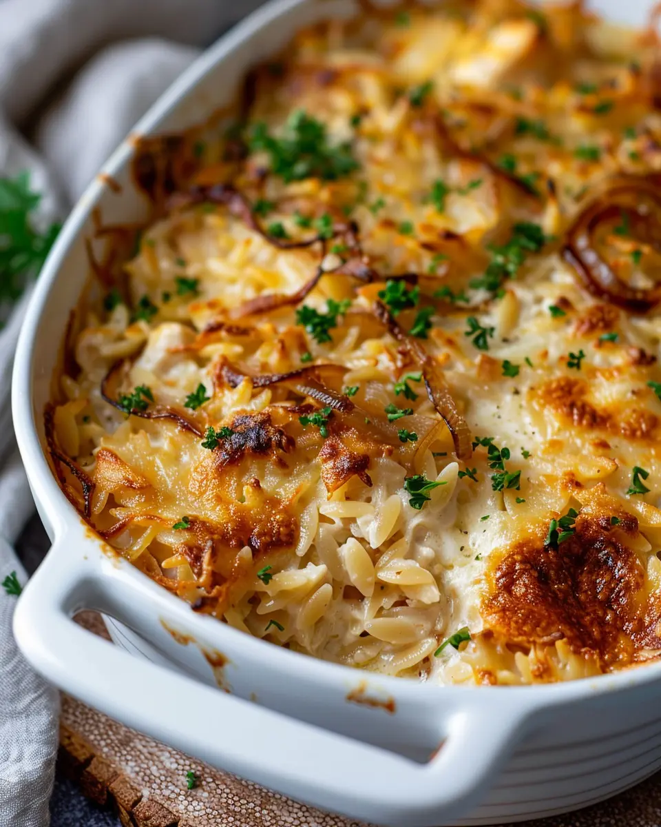 A deliciously comforting casserole that combines the richness of French onion soup with tender chicken and orzo pasta.