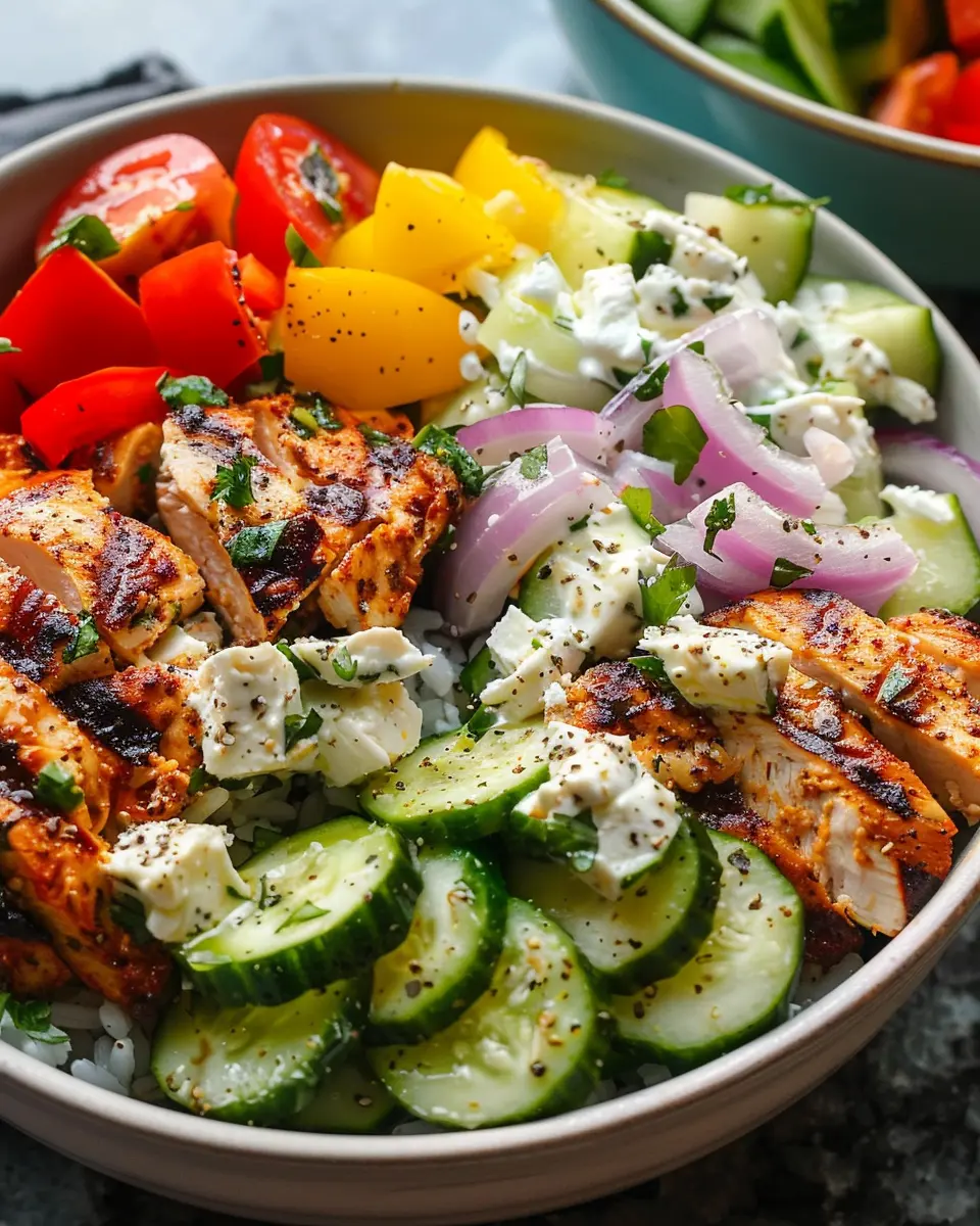 Now comes the best part—assembling your delicious Greek Chicken Bowls! Start with a base of rice or quinoa, then layer on the sliced grilled chicken, fresh vegetables, and a generous dollop of tzatziki sauce on top. Feel free to sprinkle feta cheese for an extra touch of creaminess and flavor.