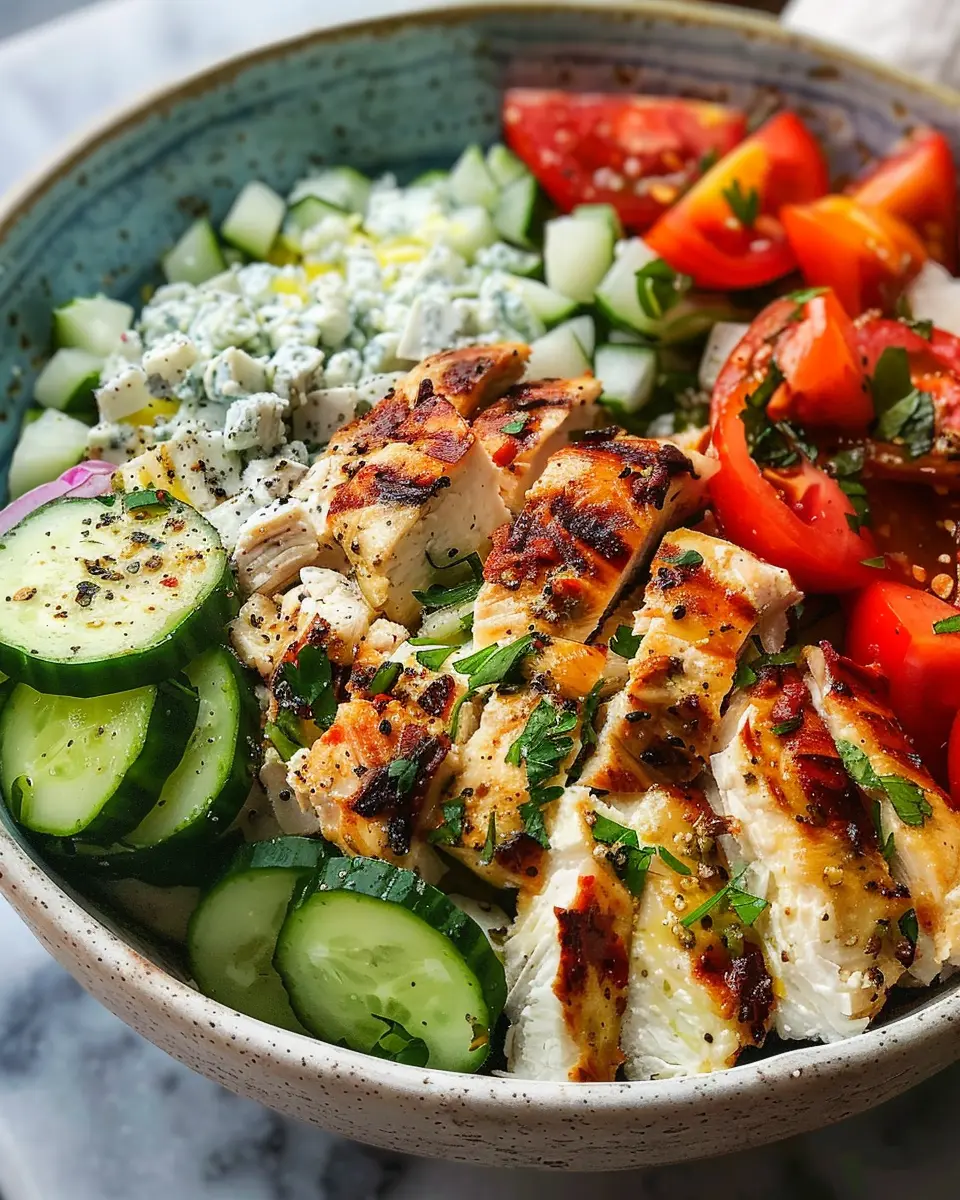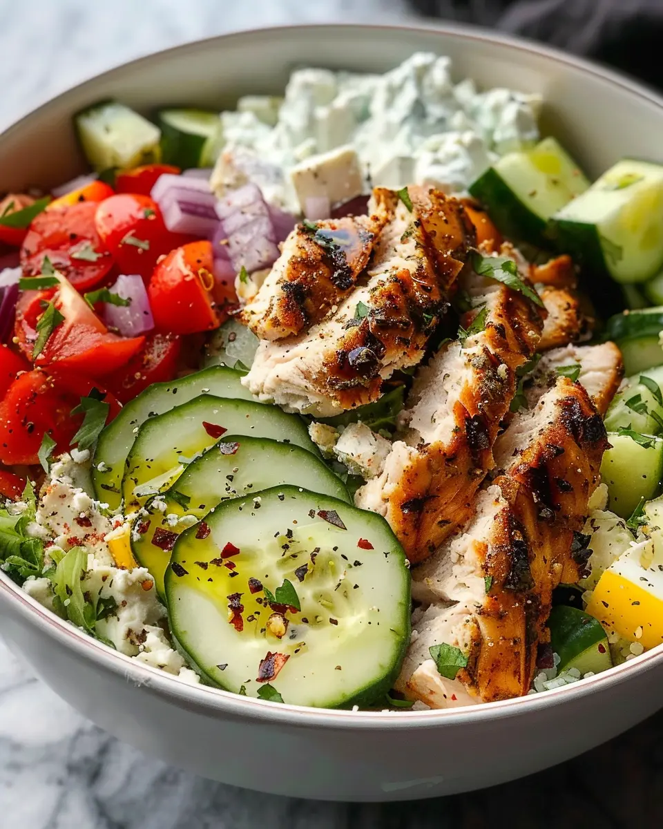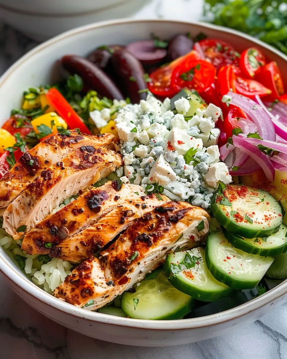 - Chicken breast: Tender and juicy chicken is the star of your bowl. Marinate in olive oil, lemon juice, and herbs for that authentic Greek taste.