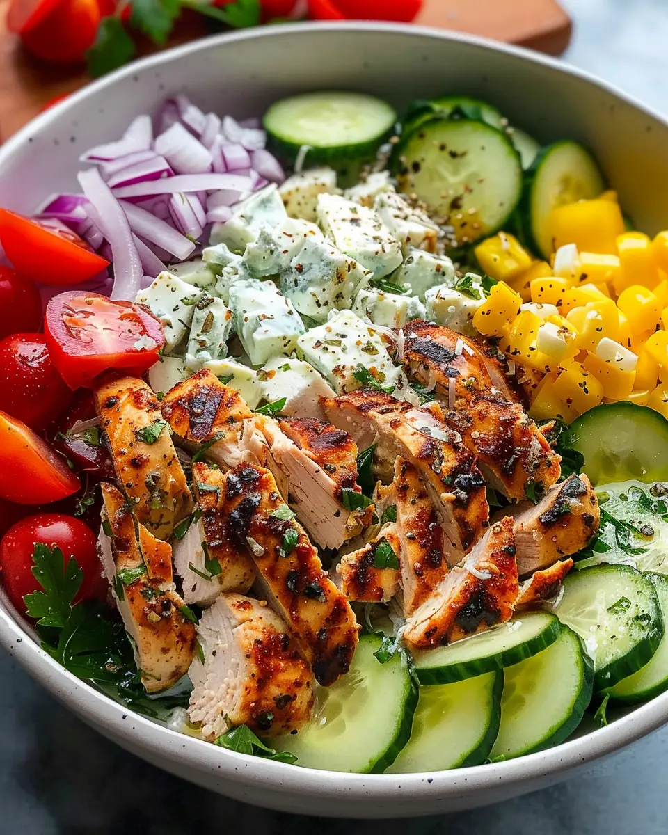 The moment you’ve been eagerly anticipating—assembly! Start by placing a scoop of rice or quinoa in each bowl as your foundation. Top with sliced chicken, a generous dollop of tzatziki, and a colorful medley of cherry tomatoes, red onion, olives, and feta cheese. Finish off with a sprinkle of fresh parsley or mint for that extra pop of flavor.