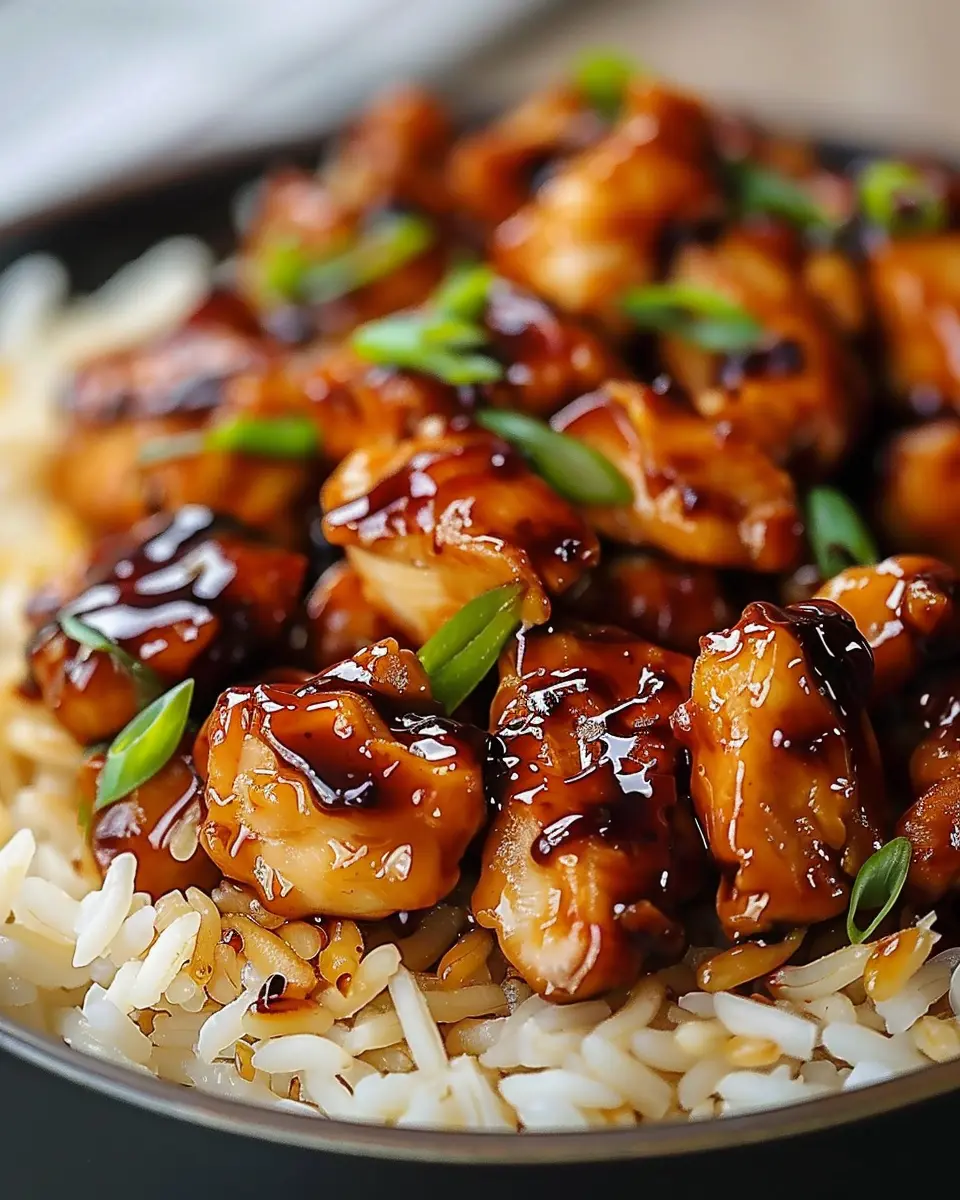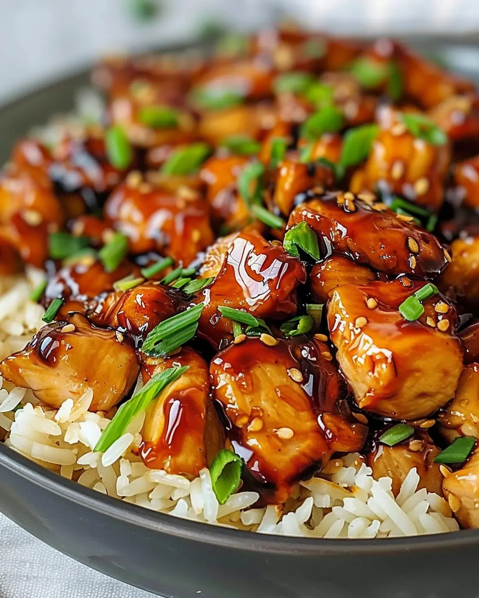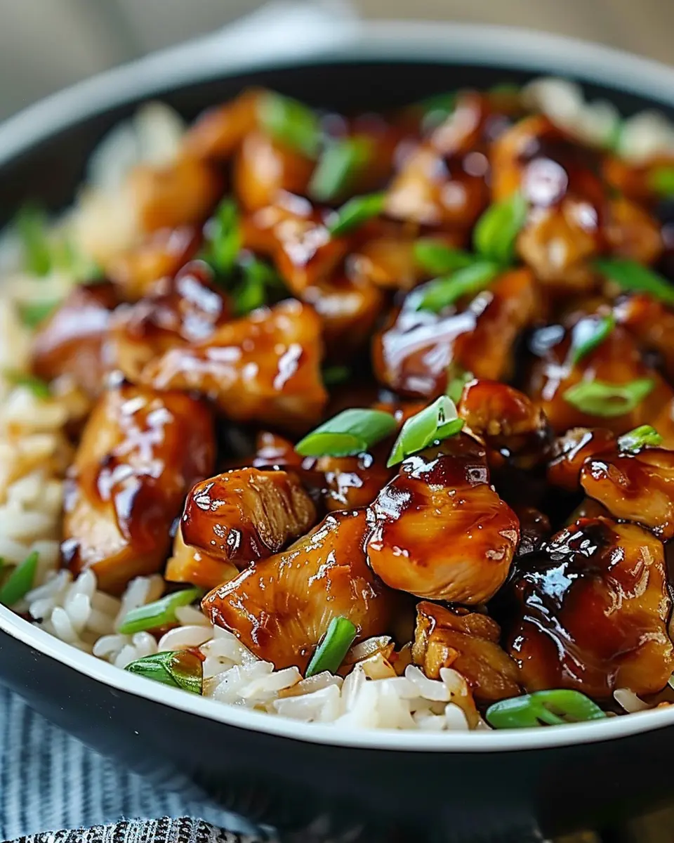 A delightful, easy-to-make family dinner featuring tender chicken tossed in honey BBQ sauce served over rice.