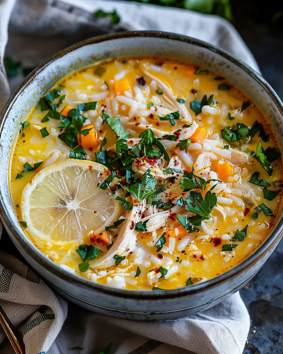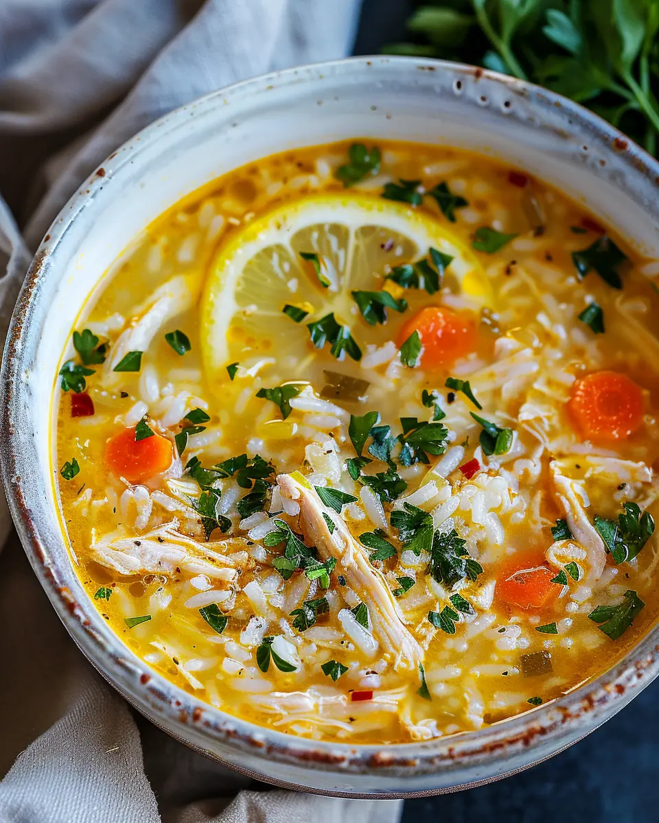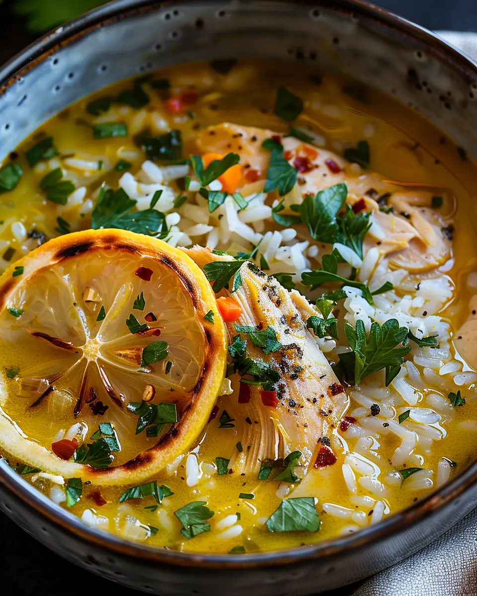 A warm and nourishing soup made with lemon, ginger, turmeric, chicken, and rice.