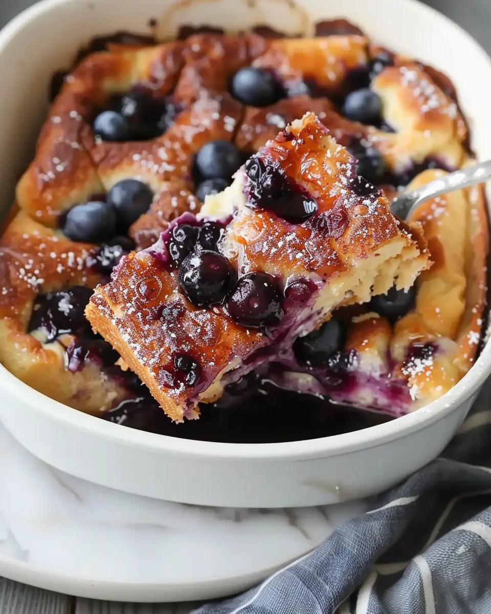 A delicious overnight breakfast casserole featuring sweet blueberries and rich, custardy French toast.