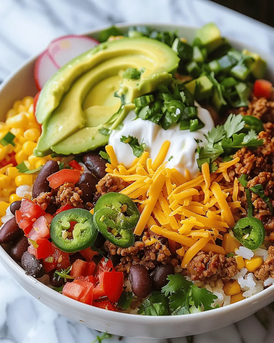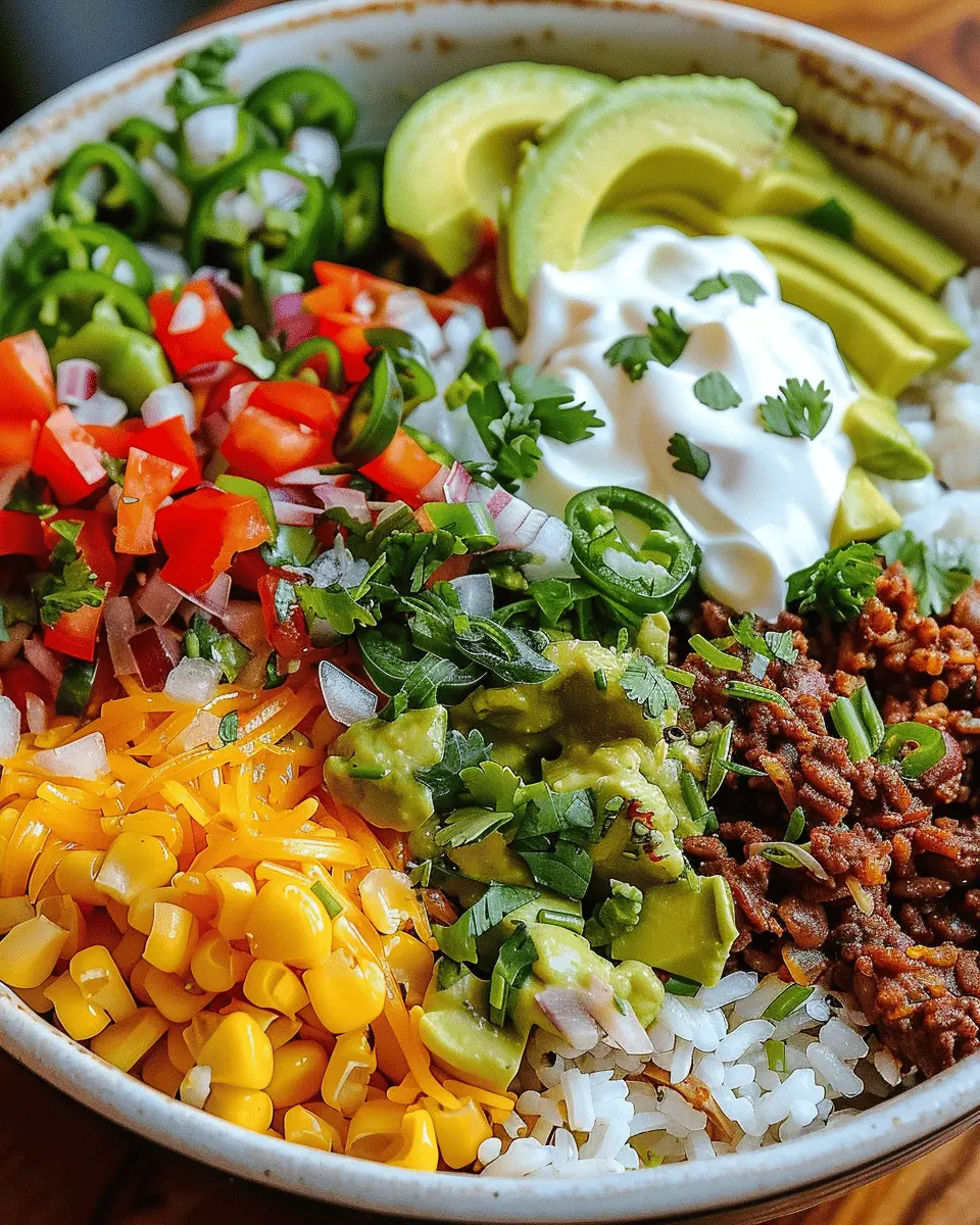 The beauty of a taco rice bowl lies in its versatility. While classic toppings like cheese, sour cream, and fresh cilantro are a must, feel free to get creative with extras. Here are some fabulous options to consider: