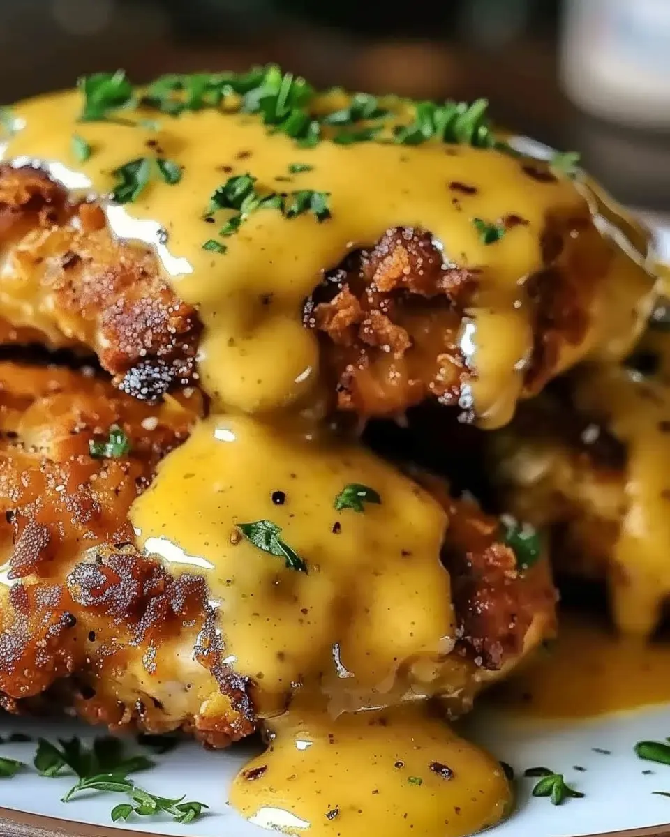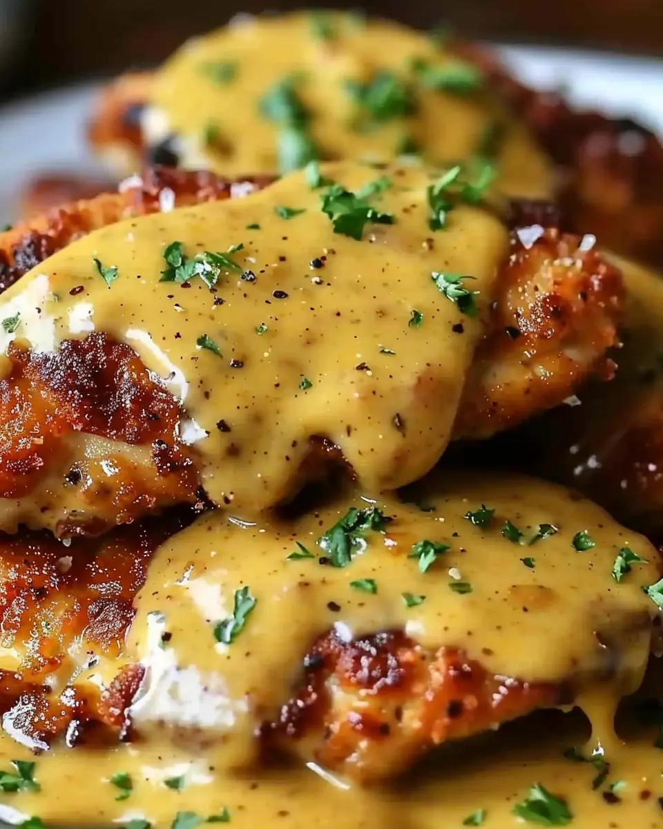 Pretzel Chicken with Mustard-Cheddar Sauce is a simple yet indulgent dish that combines crunchy pretzel coating with a rich cheese sauce.