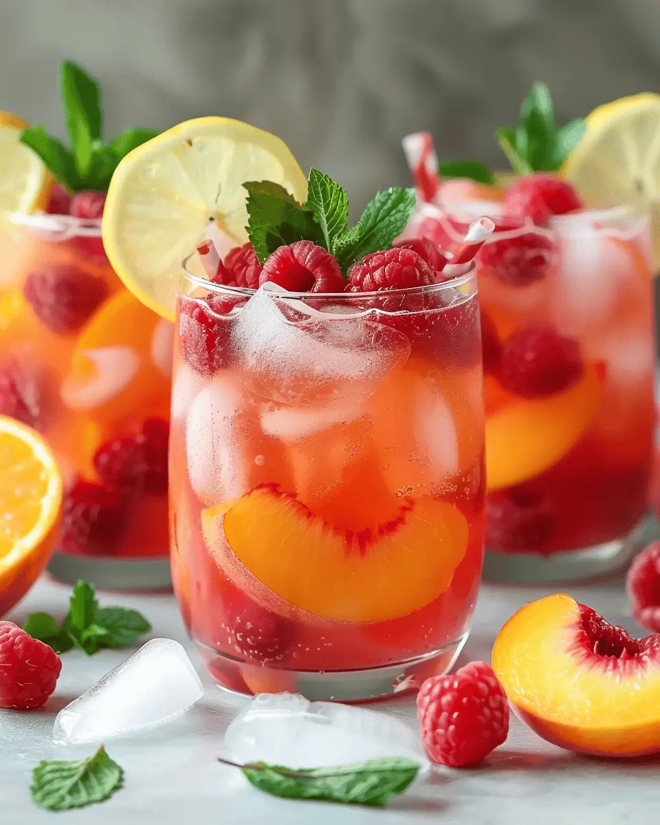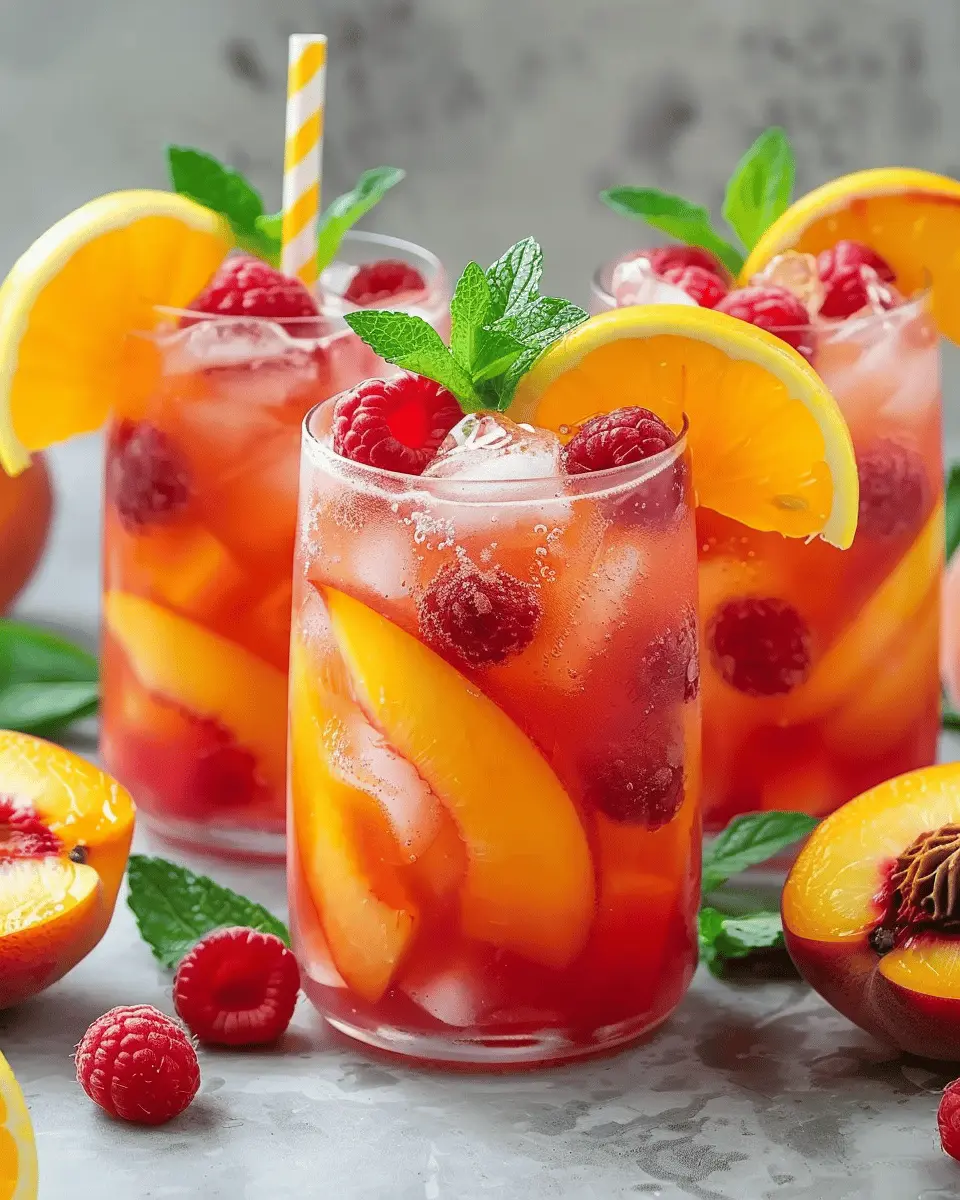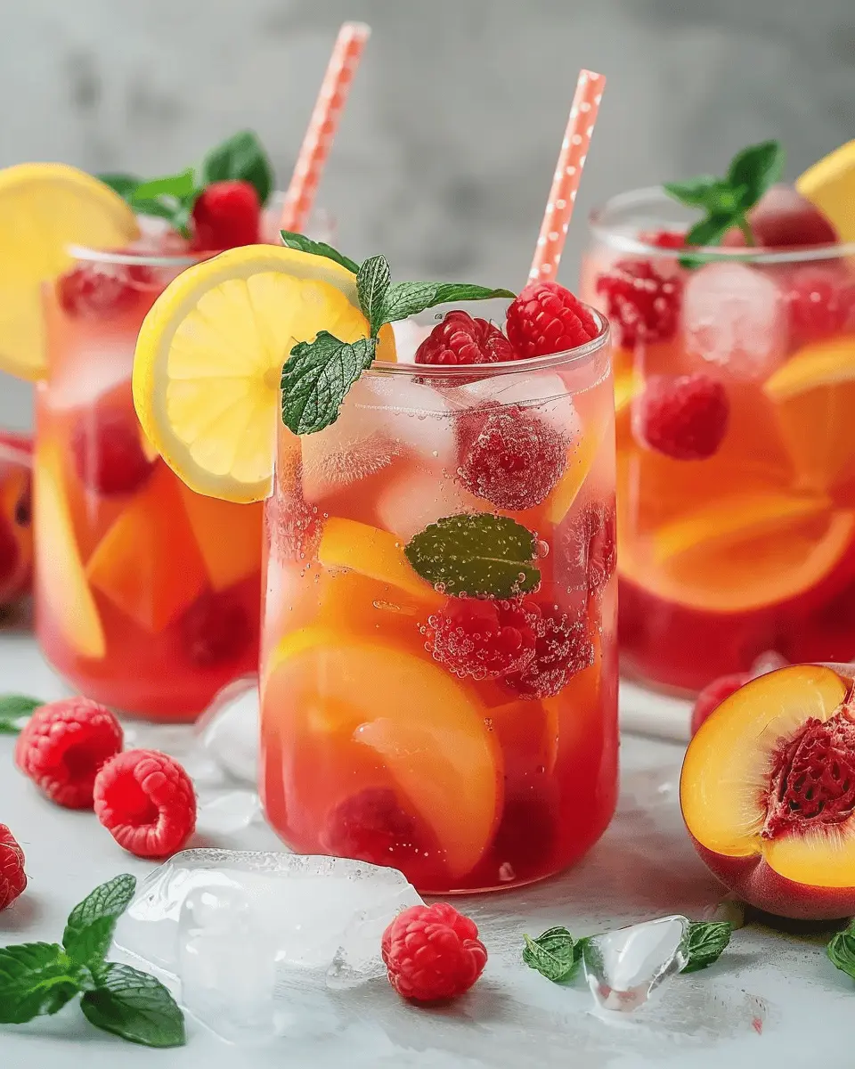 - Fresh Raspberries and Peaches: Float a few whole raspberries and peach slices in each glass. They’re not just pretty; they also enhance the flavor!