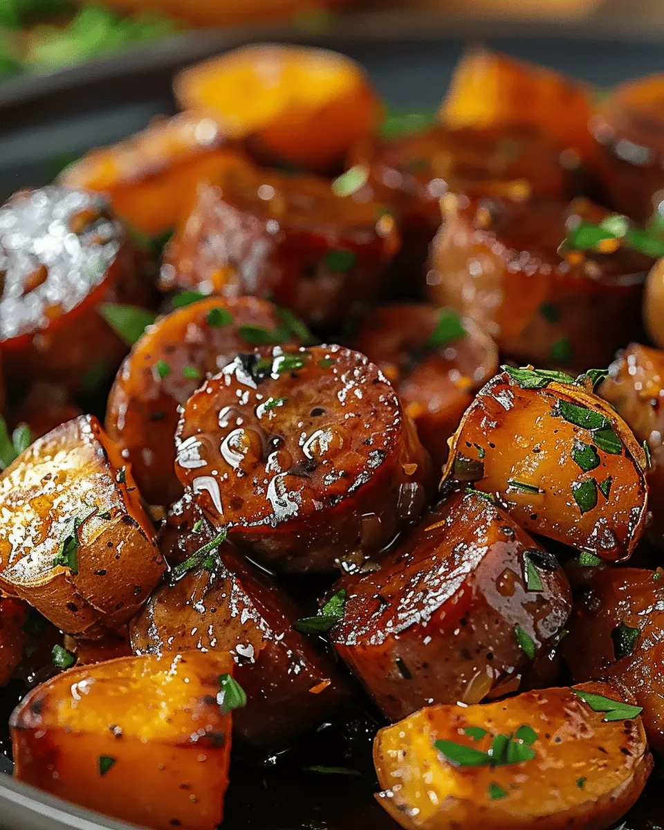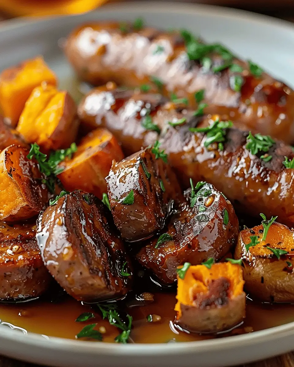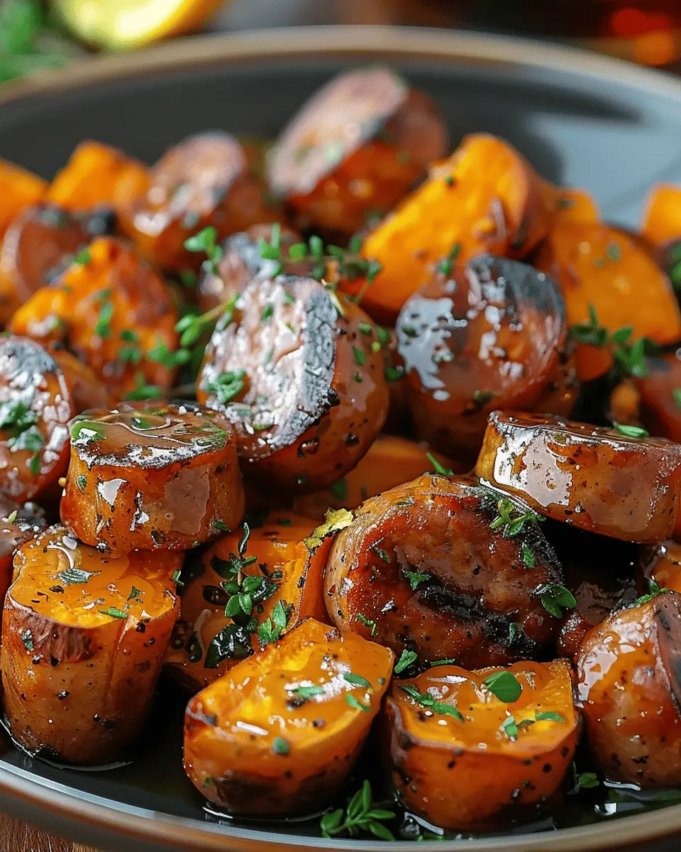 Delightful sausage and sweet potato dish with a sweet and savory honey garlic sauce, perfect for any meal.