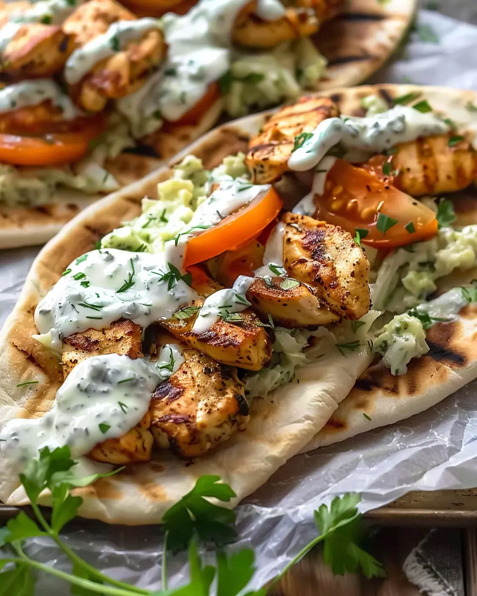 This blend of spices creates a mouthwatering chicken that pairs perfectly with the fresh ingredients in the pitas.
