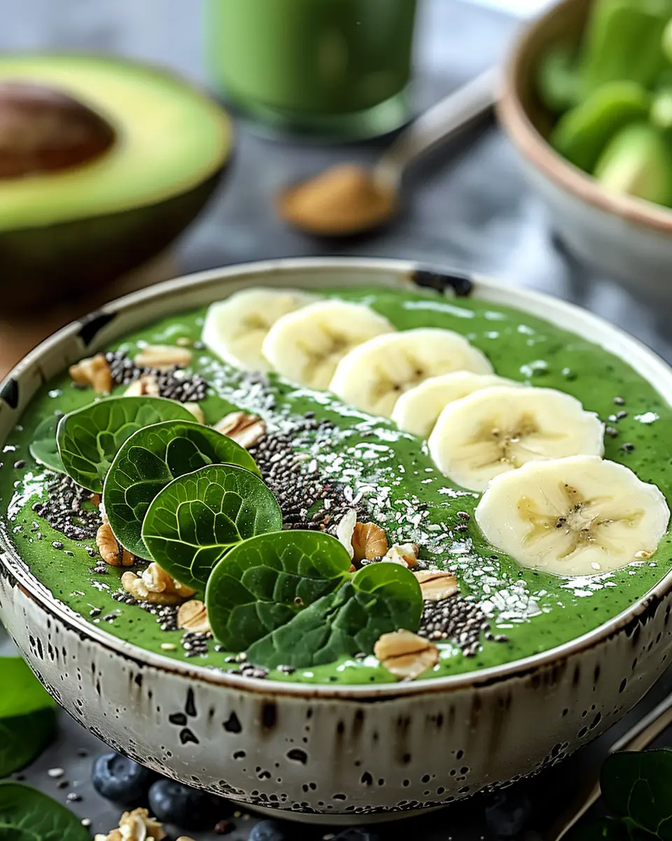 • Fresh fruits: Sliced bananas, kiwi, or berries provide a nice contrast to the green base.