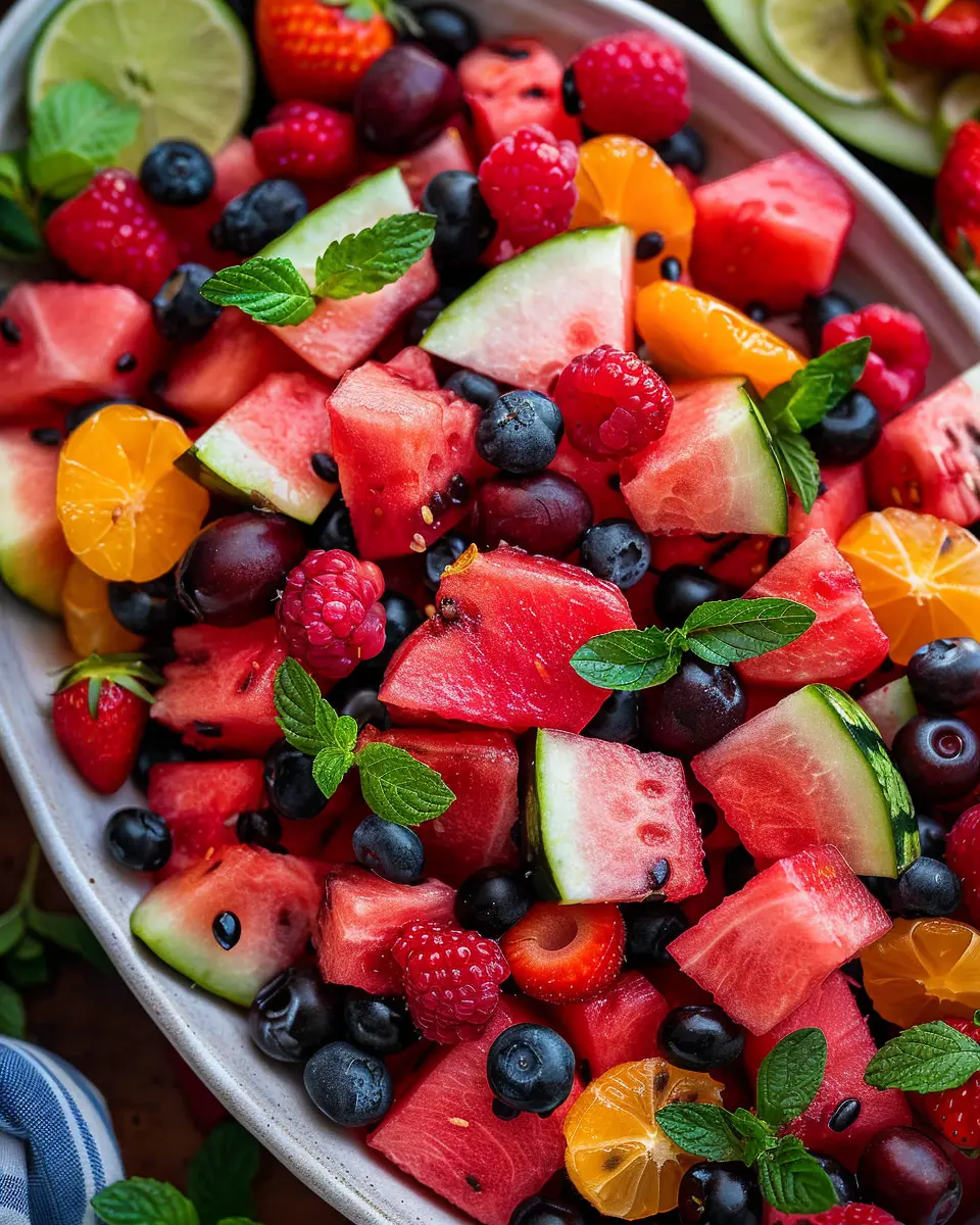 - In a large bowl, combine watermelon, blueberries, strawberries, and mint.